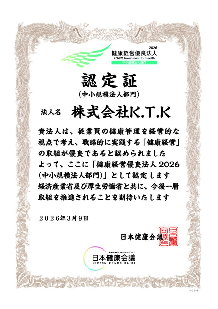 この度弊社は、経済産業省および日本健康会議が推進する【健康経営優良法人2026(中小規模法人部門)】に認定されました。