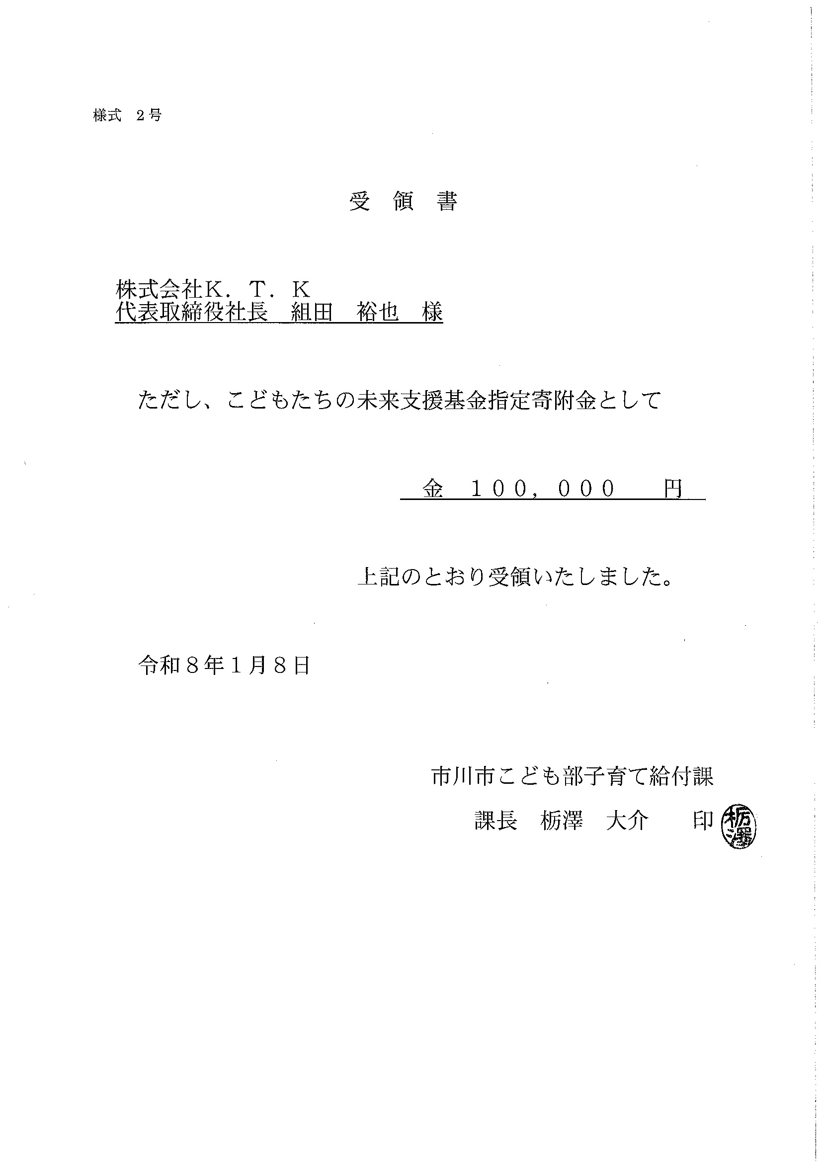 弊社の取り組みの一つである「市川市のまちづくり応援」の一環として、昨年1年間(2025/1/1~2025/12/31)の施工実績に応じて市川市「こども・子育て支援を推進する事業」「公園緑地事業」に寄付を行いました。